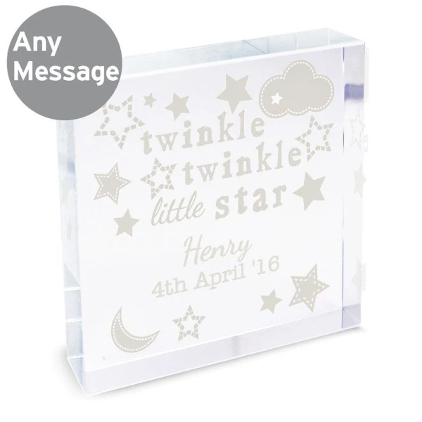 Personalise this Twinkle Twinkle Crystal Token with a message over 2 lines of up to 20 characters per line. “twinkle twinkle little star” is a fixed part of the design. All personalisation is case sensitive and will appear as entered.